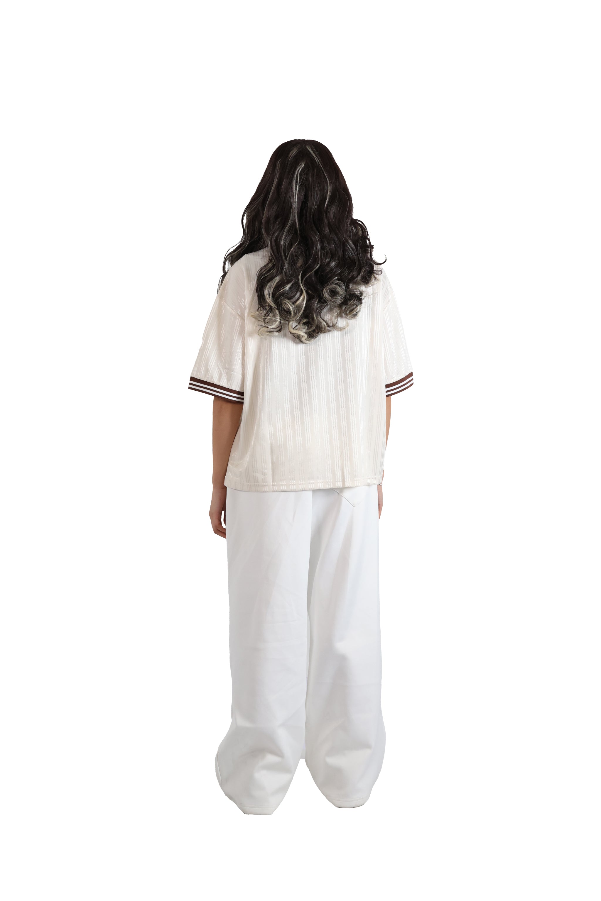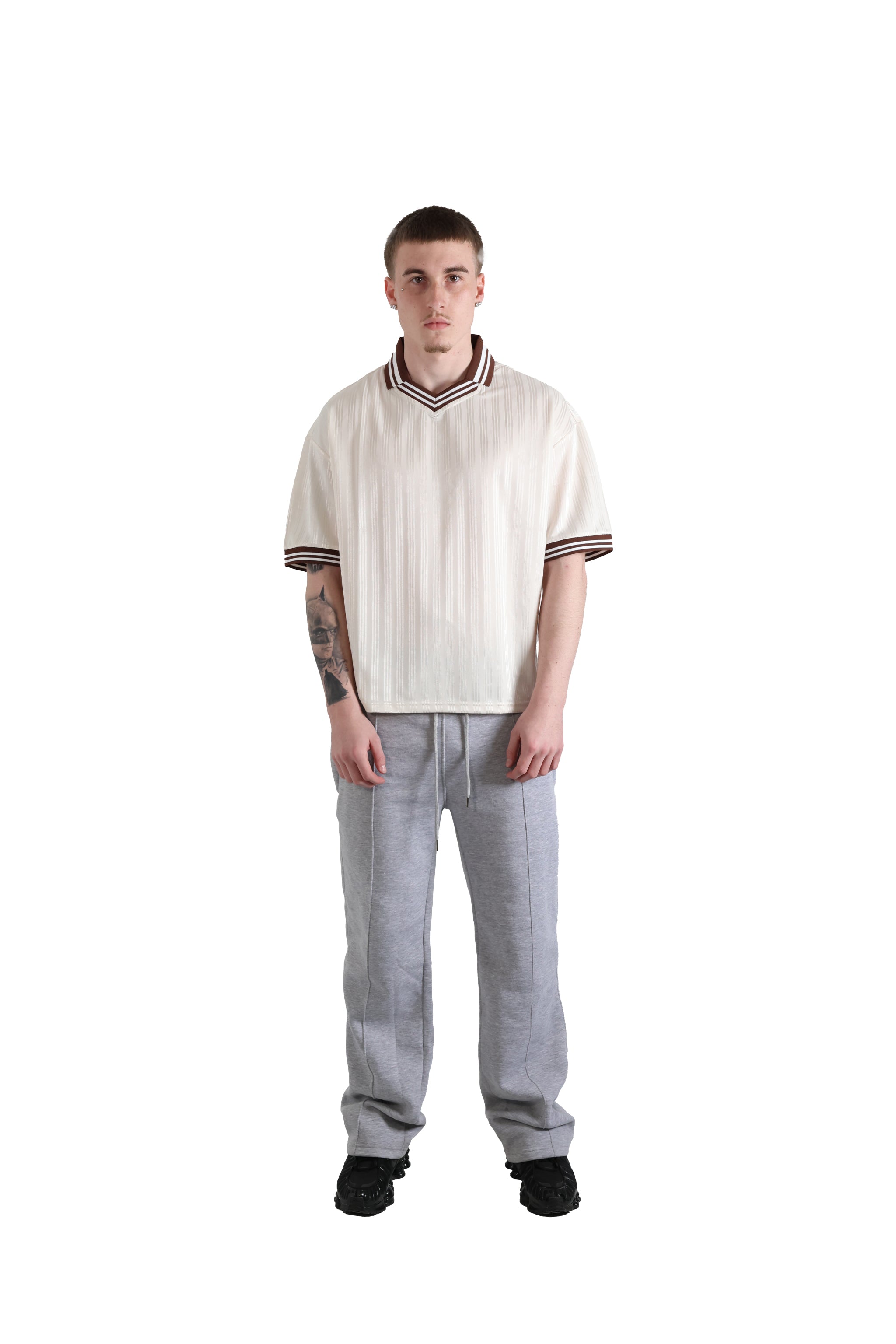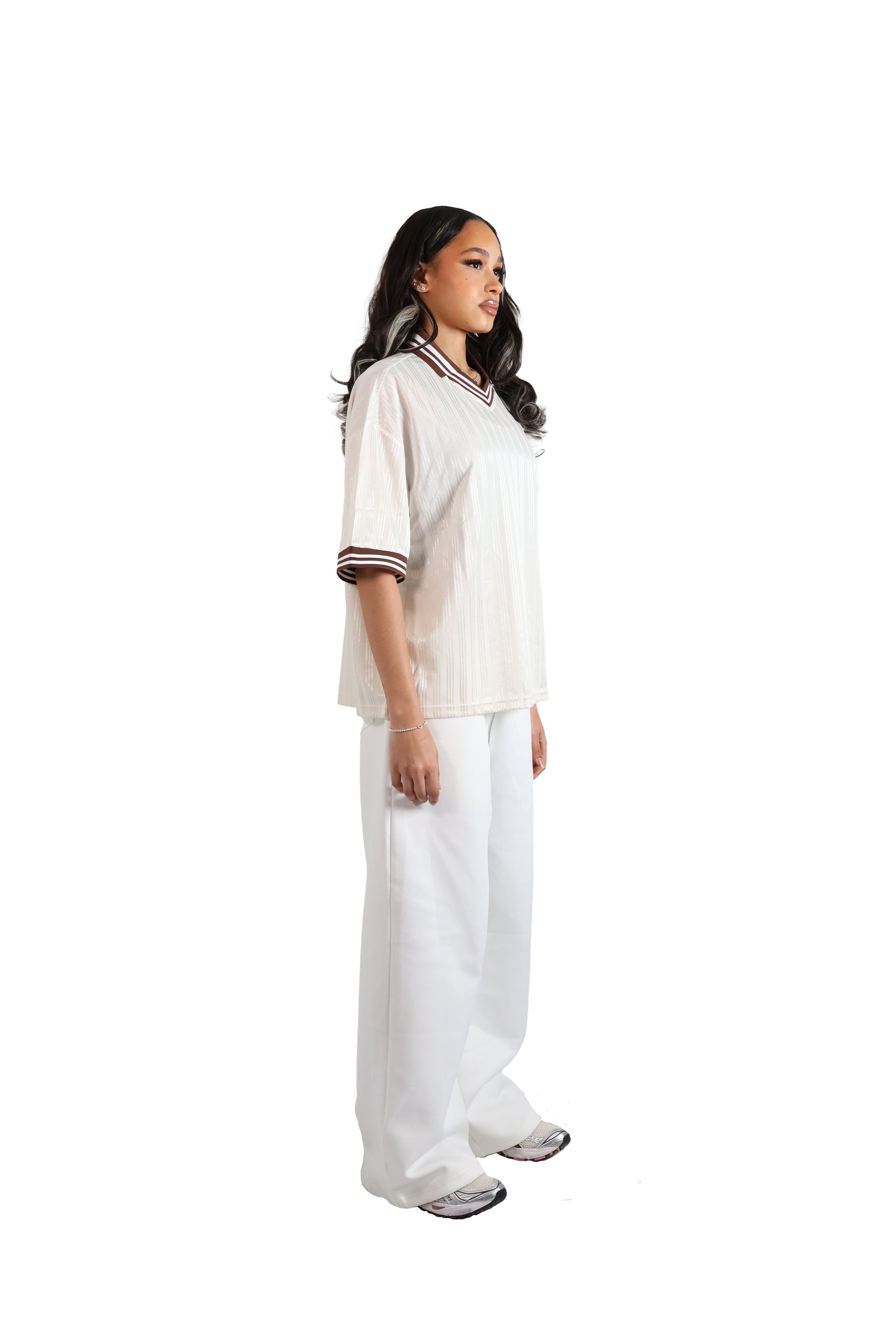 A lightweight polyester jersey, with a soft, luxurious feel to it. Complimented with a striped brown v neck ribbed collar and sleeve cuffs. With a relaxed oversized fit and drop shoulders.
