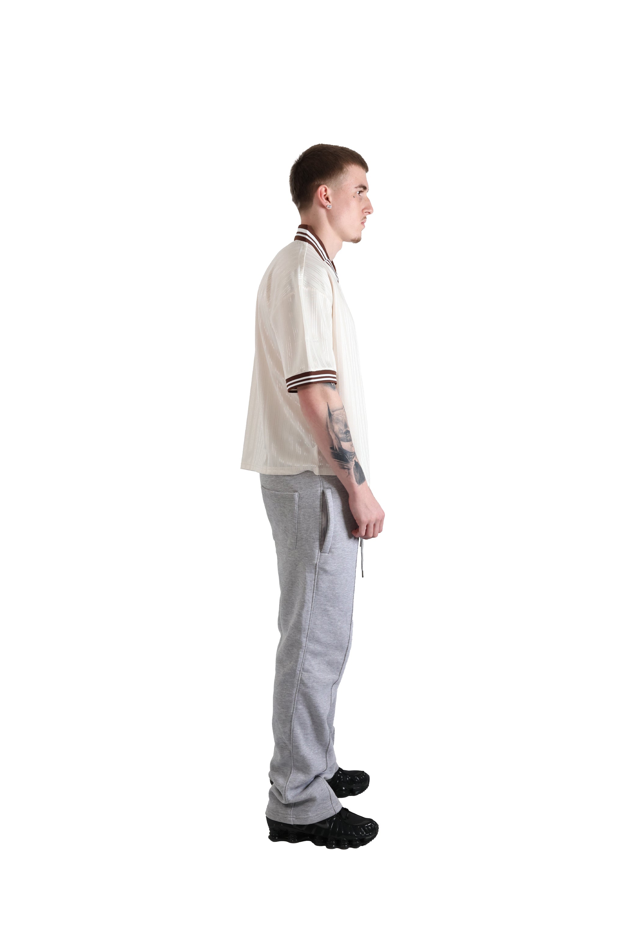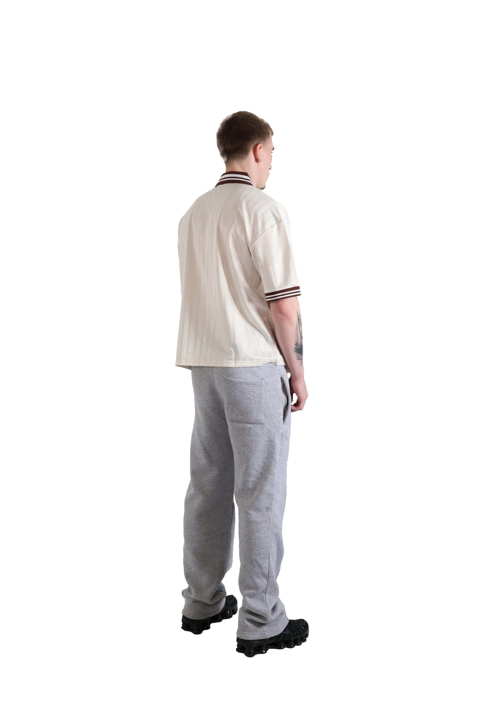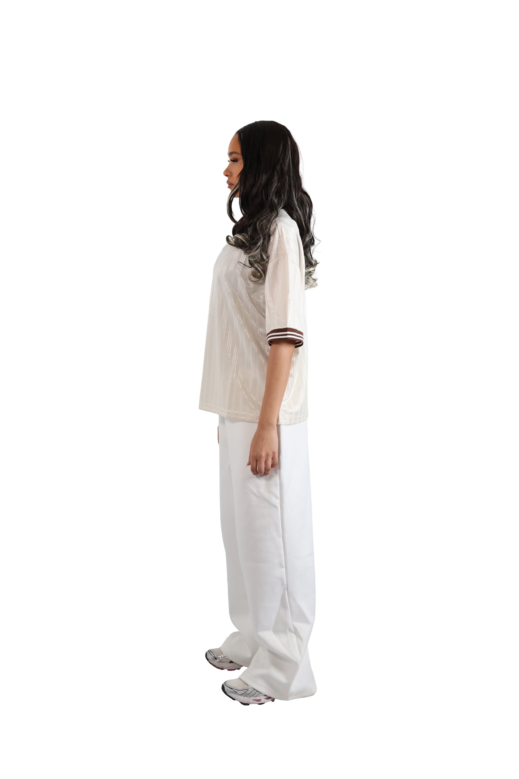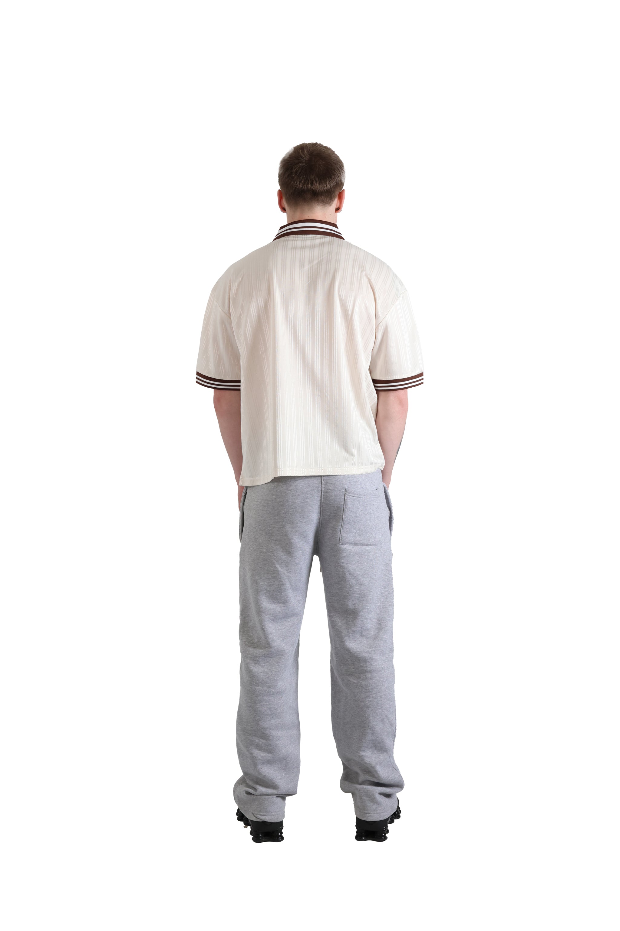 A lightweight polyester jersey, with a soft, luxurious feel to it. Complimented with a striped brown v neck ribbed collar and sleeve cuffs. With a relaxed oversized fit and drop shoulders.